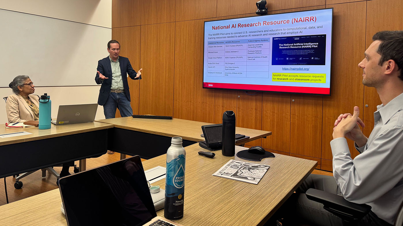 Open the image full screen.A "Brown Bag" lunch session with the Fowler College of Business facilitated valuable discussions on AI's role in academic research, highlighting both exciting opportunities and significant considerations for integration. The OpenAI team shared information about creating custom GPTs to aid in research analysis and administration, while colleagues from the IT Division and Fowler College of Business shared existing internal research resources and funding opportunities.